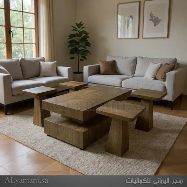 يمتاز هذا الطقم الخشبي بتصميم مستطيل عصري وعملي يجمع بين الشكل الجمالي والاستخدام المريح. الطاولة الكبيرة تأتي بأبعاد مثالية (120×60×50 سم)، مما يتيح استخدامًا متعدد الوظائف سواء للضيافة أو للديكور. أما الطاولات الجانبية الأربع، فتأتي بقياس (35×35×55 سم)، وتوفر حلولًا متعددة يمكن توزيعها بسهولة في أركان المجلس أو بجانب الأرائك والكراسي.