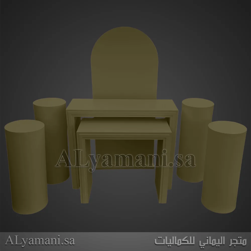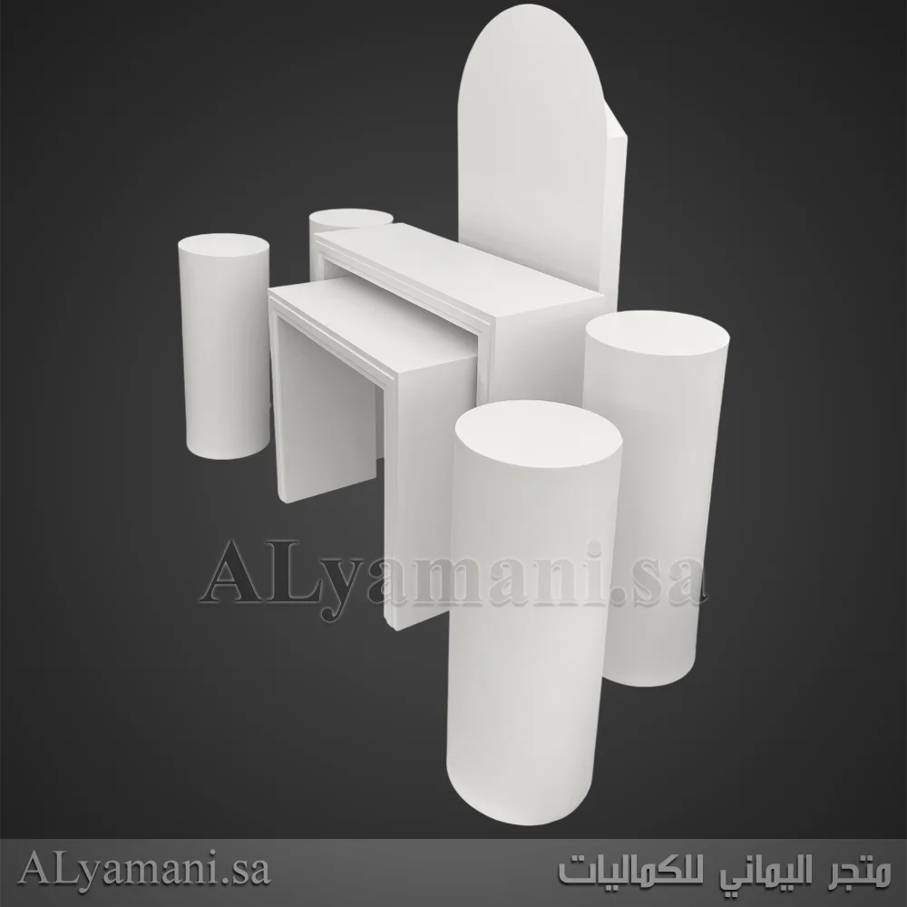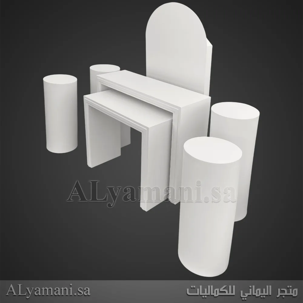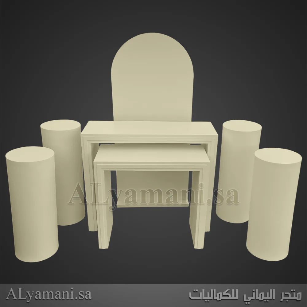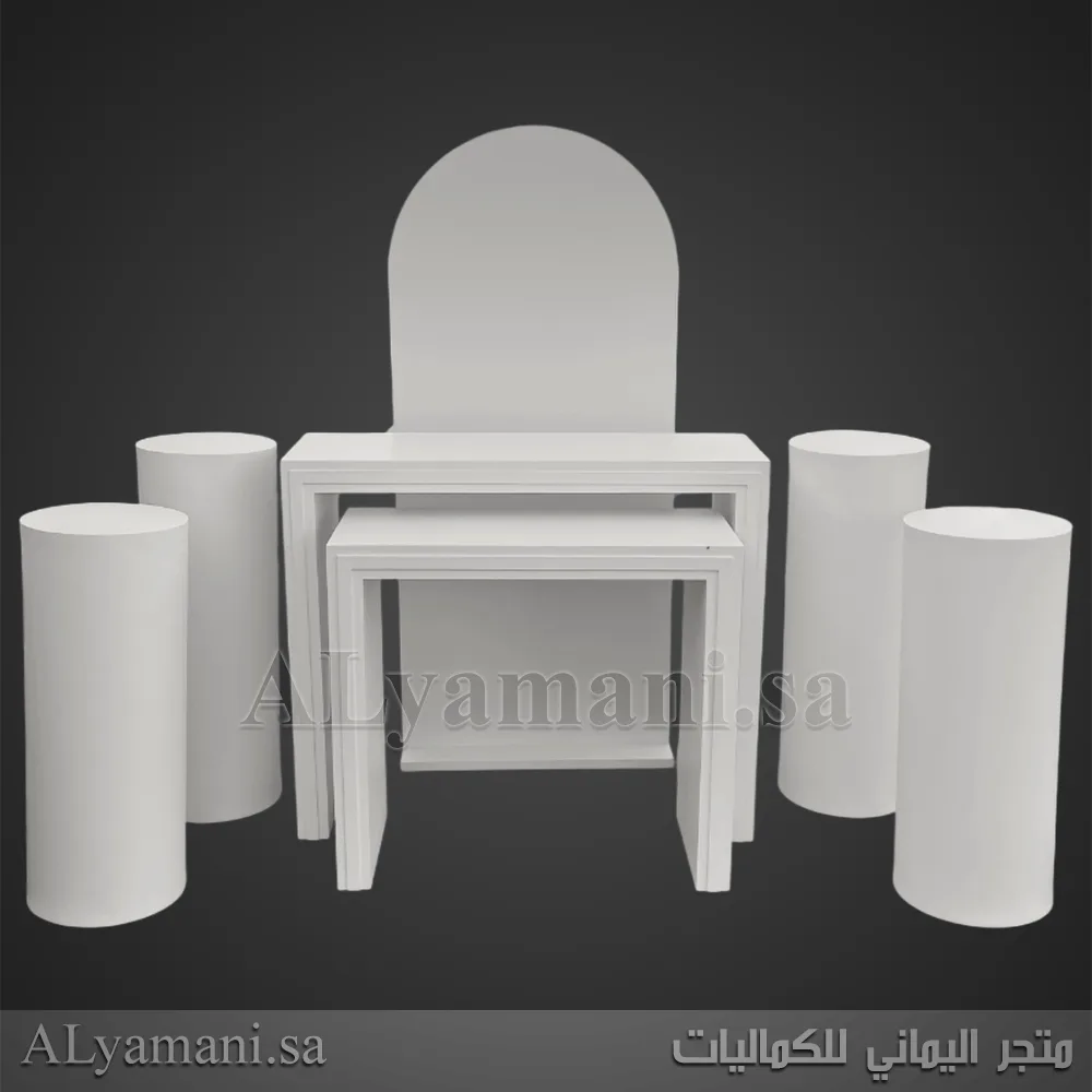 يتكون هذا الطقم من 7 قطع: طاولتين بتصميم مربع، خلفية مقوسة، وأربعة ستاندات اسطوانية بأحجام مختلفة.