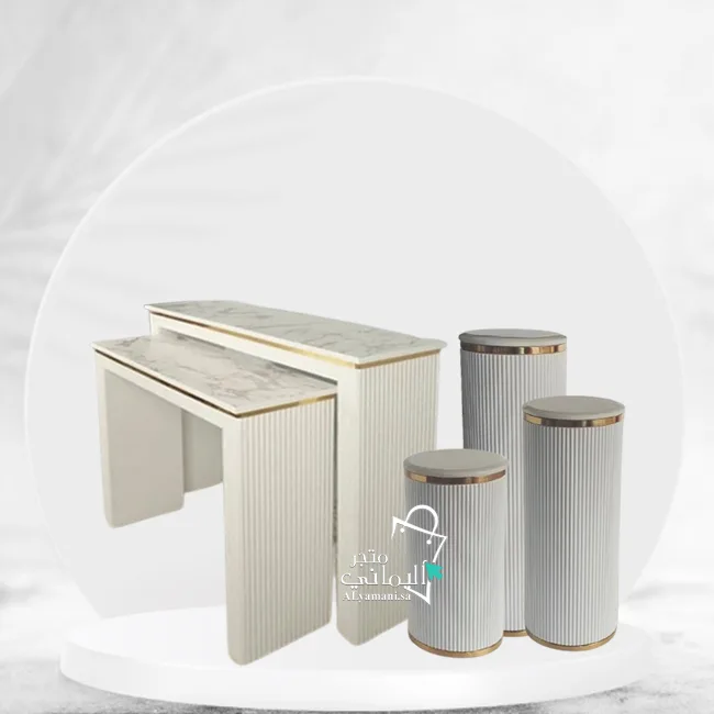 - التصميم المقلم: كذلك, التفاصيل المقلمة على الطاولتين والستاندات تضيف لمسة من الأناقة والتفرد، مما يجعل الطقم قطعة مميزة.