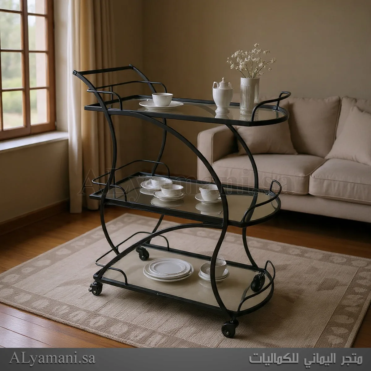 عربية ضيافة مودرن توفر لك مساحة واسعة بفضل أرففها الثلاثة المصنوعة من الزجاج. من ناحية أخرى تتيح لك هذه الأرفف ترتيب أطقم القهوة والحلا بكل أريحية وتنظيم. إضافة إلى ذلك فإن الزجاج الشفاف والنقي يعكس الضوء بطريقة ساحرة تزيد من بهجة المكان. علاوة على أن توزيع الأدوار يسمح بعرض أصناف متعددة من الضيافة الفاخرة.