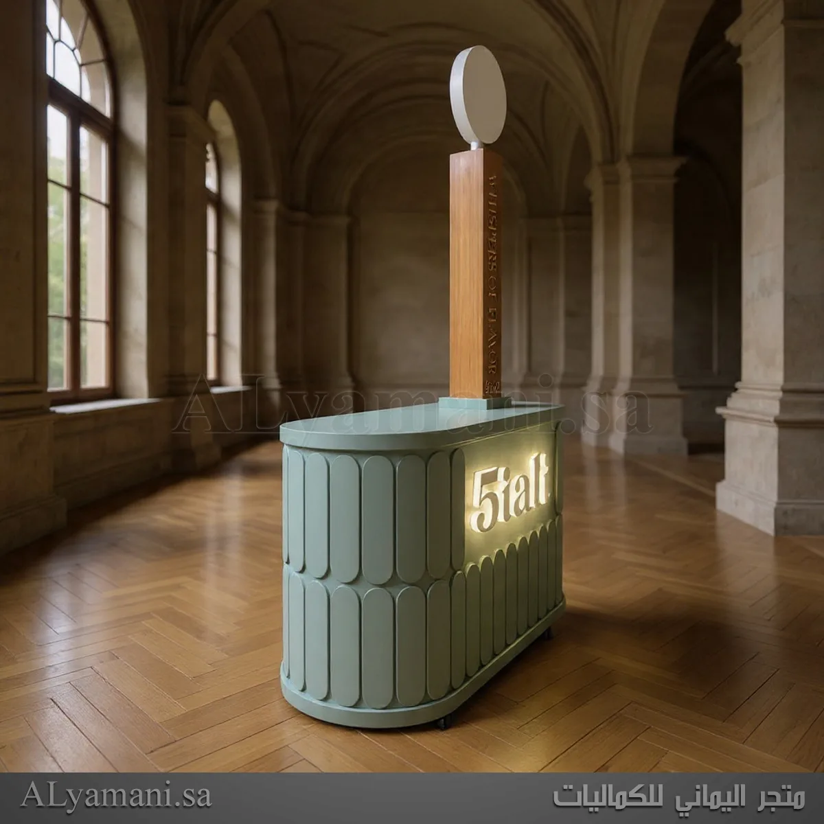 كورنر كوفي فاخر بتصميم مودرن للمشروبات والتراميسو يأتي بلون ميرمي الأخضر الزيتوني الفاتح مع عمود معتق خشبي يعطي طابع فاخر ومميز. من ناحية أخرى الرش السادة الربع لامع يعزز الإحساس بالفخامة. هذه التوليفة اللونية تم اختيارها لتناسب أجواء الكافيهات الحديثة والفعاليات الراقية.