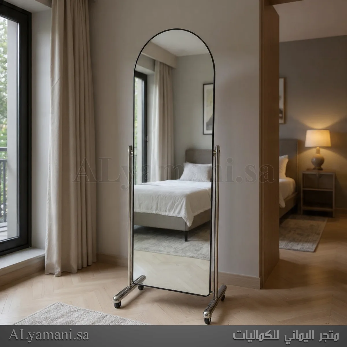 تأتي هذه المرايا الأرضية بتصميم مقوس أنيق يمنح الغرفة مظهراً أكثر جاذبية. الإطار المتحرك مع وجود الكفرات يجعل من السهل نقلها بين الغرف أو تعديل مكانها حسب الحاجة، مما يوفر لك مرونة تامة في الديكور.